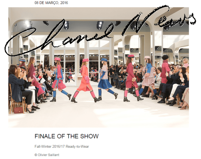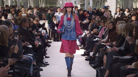 CHaNeL tem jeans, pérolas, matelassado, camélias, o chapéu símbolo Coco Chanel dos anos 50, o P&B. Muitas nuances de rosa, e a atualidade com estampas e joias de emojis, mãos fazendo o sinal de paz e amor, trevo de quatro folhas e o monograma da Chanel; capuz (rosa quartzo, em Kendall Jenner); bota usada com vestidos e tailleurs. Maquiagens clássicas e ousadas (sombra matelassê).