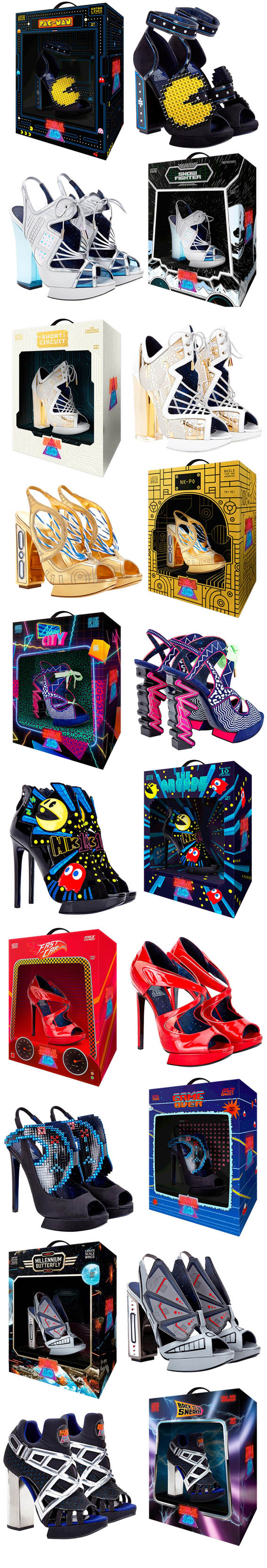 O talentoso designer de sapatos britânico Nicholas Kirkwood, projetou 10 – uma coleção de sapatos inspirados na cultura pop dos anos 80 com influência dos jogos de vídeo game, filmes e brinquedos através dos inesquecíveis ícones do Pac Man, De Volta para o Futuro, Star Wars ou Space Invaders. Essa fantástica e exclusiva coleção de sapatos é um tributo aos anos 80 para as nostálgicas fashionistas de plantão! Tem inclusive acessórios!