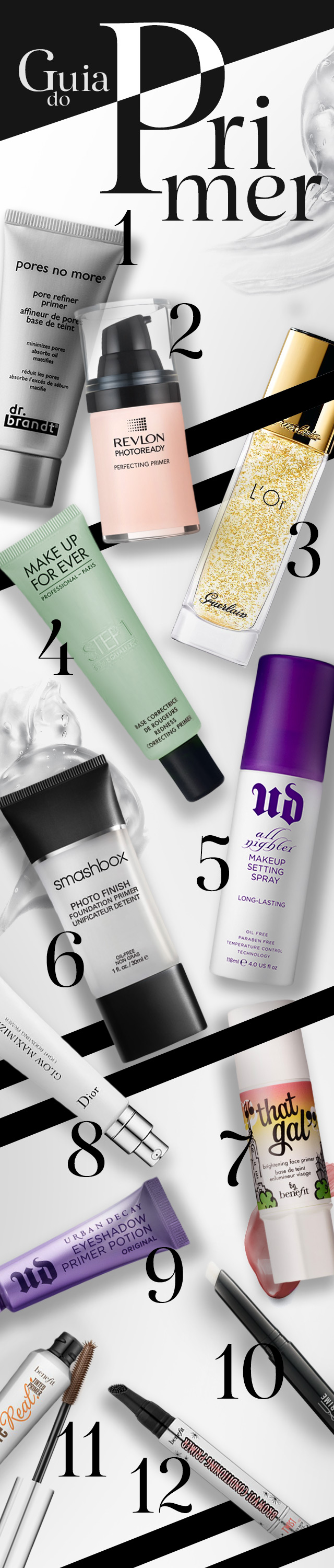 Ou então, aposte em versões específicos para algumas áreas como olhos e boca, que proporcionam acabamentos incríveis. O Primer Potion de Urban Decay (9) intensifica a sombra, evita que ela se acumule nas pálpebras e aumenta sua duração, já o Prep n Prime da MAC (10) irá fazer com que o seu batom dure muito mais.