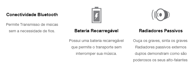 É alimentado por uma bateria recarregável com até 5 horas de reprodução, e viva-voz com cancelamento de ruído, permitindo que você atenda chamadas sem desligar sua caixa de som.