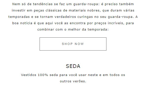 Entre os lançamentos se destacam os vestidos, bermudas, camisas e shorts em seda e linho. Já a gama de cores abrange tons como marinho, marrom e camelo e também outros mais frescos como amarelo, pêssego, nude, azul, cinza, bege e off white.