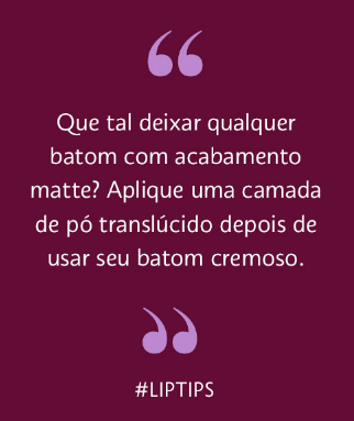 Para combater e disfarçar aquelas ruguinhas ao redor dos lábios, use o lápis labial para fazer todo o contorno da boca e dê preferência aos batons de acabamento matte. Como são mais sequinhos, estes produtos não escorrem e preenchem os lábios de maneira uniforme, mesmo nos sulcos, disfarçando a presença deles.