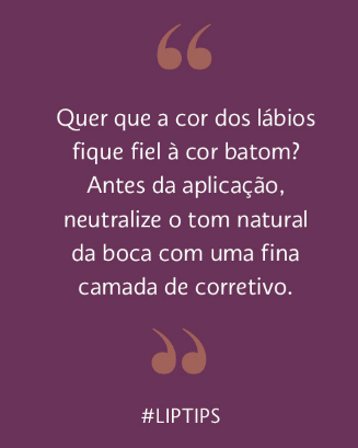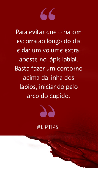 Se você quiser usar um batom de acabamento cintilante ou gloss, reforce o contorno dos lábios com lápis labial fazendo um novo contorno, dessa vez com um lápis da cor da sua pele passando por fora do contorno dos lábios. Além de iluminar a região ele preencherá os sulcos da pele evitando que o batom escorra por eles e borre. 🙂